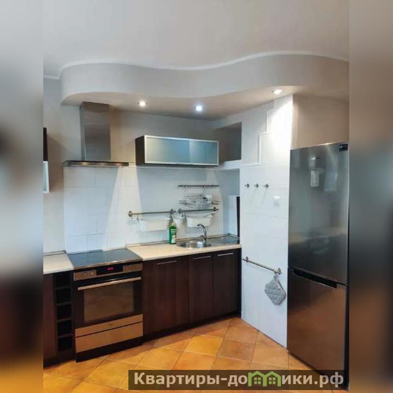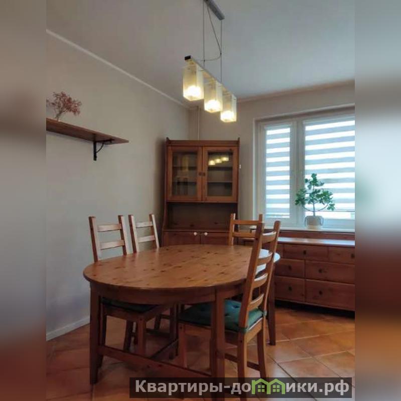 Просторную кухню, радующую отсутствием нехватки места. Есть плита, совмещенная с духовкой, вытяжка, стальной холодильник, овальный обеденный стол, вмещающий до 6 человек.