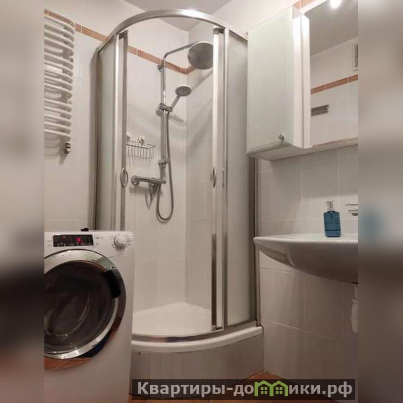 Санузел, в котором располагается вместительная душевая, стиральная машина, раковина, а так же радиатор для сушки.