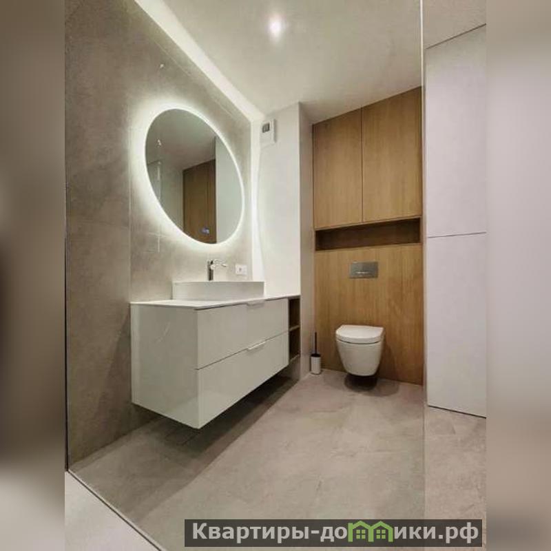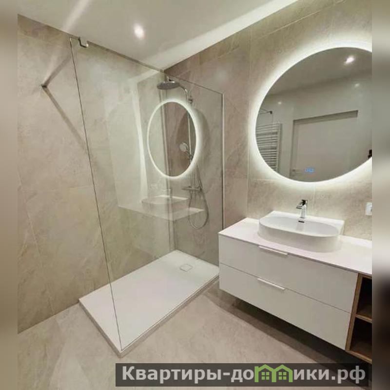 Ванна просторная, вмещает стеклянную душевую, зеркало с контурной подсветкой, выдвижные ящики под раковиной, а так же подвесной унитаз со скрытым баком.