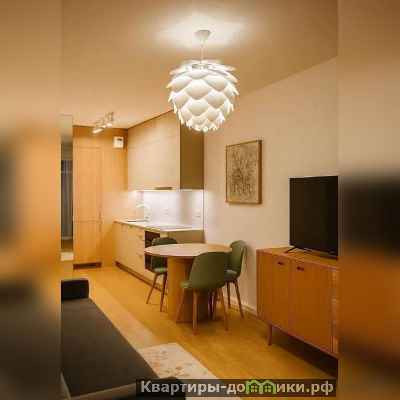 Гостиная освещается дизайнерской люстрой в форме бутона. Благодаря кондиционеру поддерживается комфортная температура воздуха. Мягкий диван станет центром приема гостей. Напротив него широкоугольный телевизор, подключенный к медиа станции.