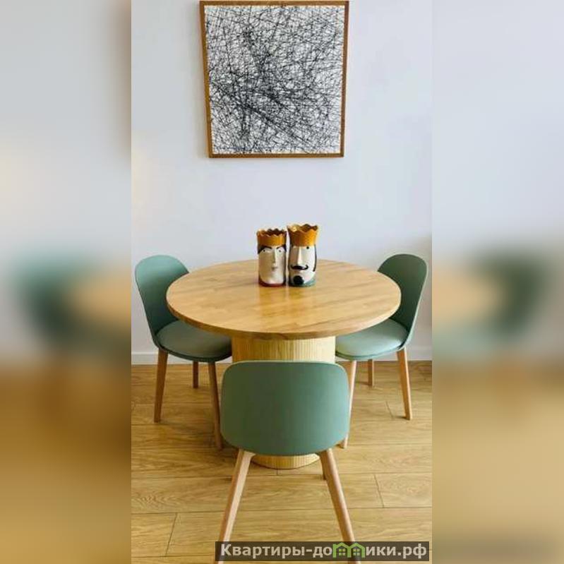 Круглый стол служит для приема пищи. Отделяет гостиную от кухни, на которой имеется варочная панель с сенсорным управлением, духовка, гибкий смеситель и розетки для дополнительного оборудования.