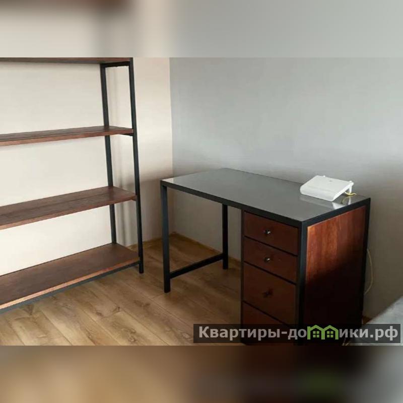 В спальне складной диван углового типа. Напротив него телевизор и журнальный столик. В углу комнаты стеллаж для личных вещей и рабочий стол с вай-фай роутером.