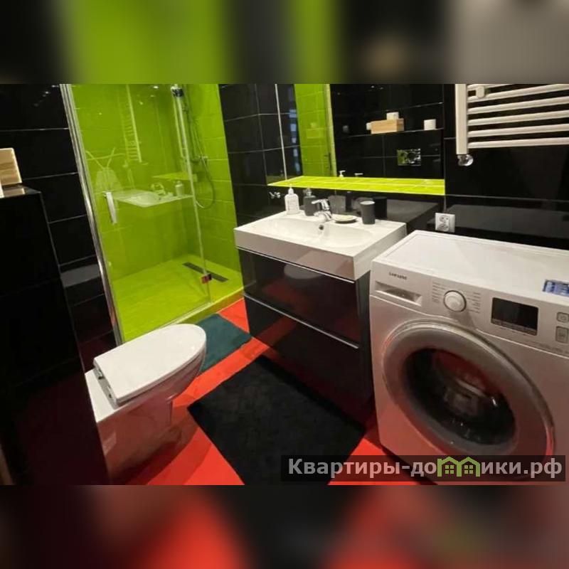 Ванная оснащена стиральной машиной, выдвижными ящиками и раковиной, подвесным унитазом и душем.