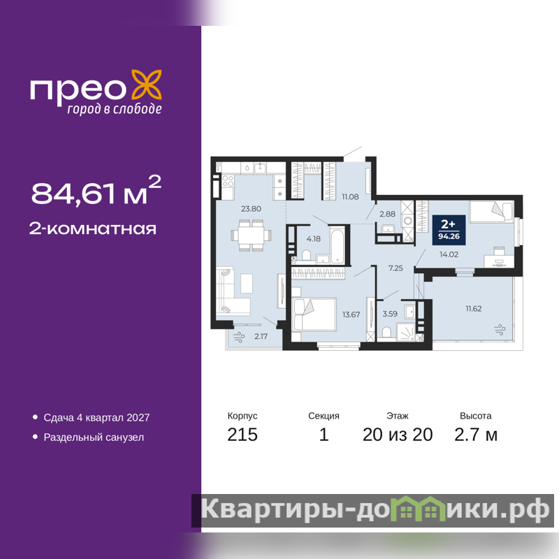 Продается двухкомнатная квартира с предчистовой отделкой в ЖК "Прео" на 20 этаже. Общая площадь: 84.61 кв.м., жилая: 27.69 кв.м., площадь просторной кухни-столовой: 23.8 кв.м. Угловая квартира, очень светлая, естественная вентиляция при открытии окон. В квартире одна лоджия, два совмещенных и один раздельный санузел. Терраса представляет собой роскошную зону отдыха для проведение вечеров в кругу семьи и друзей или организация вечеринок. Высота потолков 2.7 м.