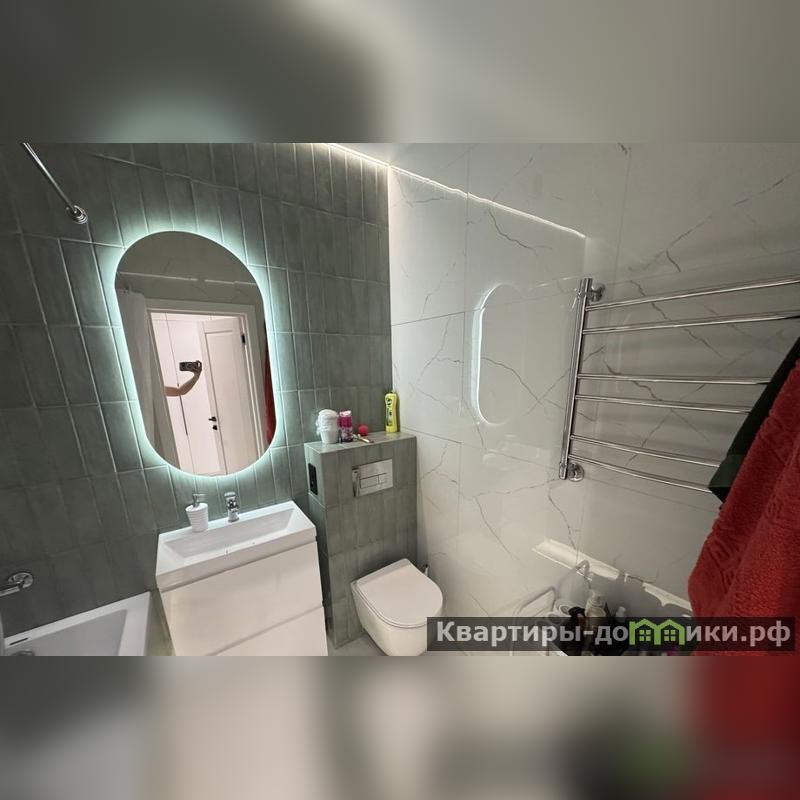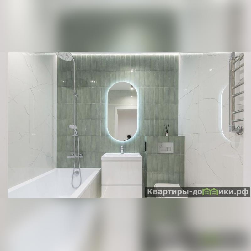 Санузел оформлен в нежных оттенках светлой плитки с зелеными элементами, подчеркивающими близость природы. Удобная сантехника премиум-класса позволяет расслабиться после трудового дня.