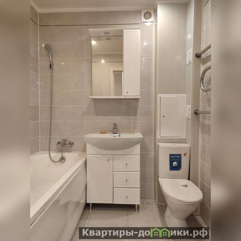Современный санузел, отделанный стильной плиткой и акриловая ванная оставляют приятное впечатление.