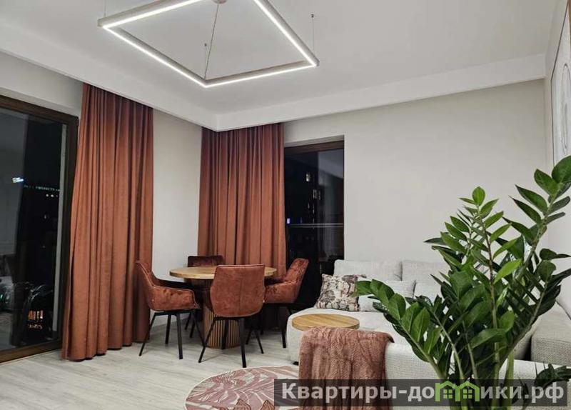 Просторный зал станет центром встреч с друзьями и родственниками. Можно собраться за круглым столом и поиграть в настольные игры. Вместе посмотреть фильмы, сериалы или любимые телевизионные каналы на широком мониторе (такой же повешен и в спальне для повседневного досуга). Здесь же находится выход на балкон, с которого открывается красивый вид на вечерний город.