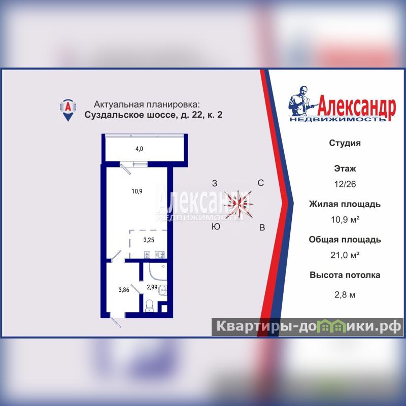 Общая площадь 21 кв.м. + застеклённый балкон 4 кв.м.