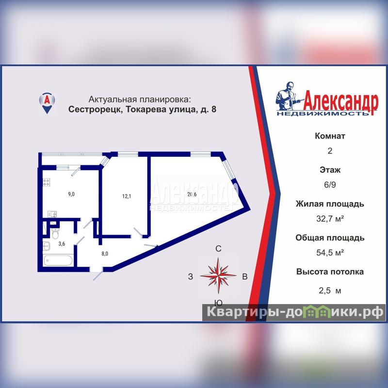 Общая площадь с балконом 54,5 кв.м., кухня 9 кв.м., изолированные комнаты 20,6 + 12,1 кв.м., большая прихожая 8 кв.м, просторный совмещенный с/у, застекленный балкон с красивейшими вечерними закатами, комфортная юго-западная сторона.