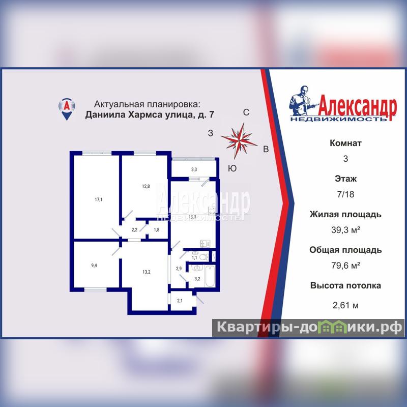 Общая площадь квартиры: 79,60 кв.м. Жилая площадь: 39,30 кв.м.