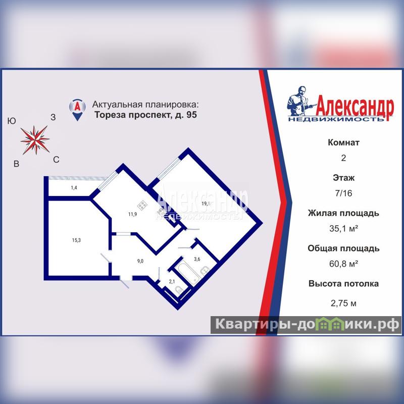 В квартире 2 изолированные комнаты (19,8 и 15,3 кв м), кухня (11,9 кв м), прихожая с коридором (9 кв м), раздельные ванная комната (3,6 кв м) и туалет (2,1 кв м).