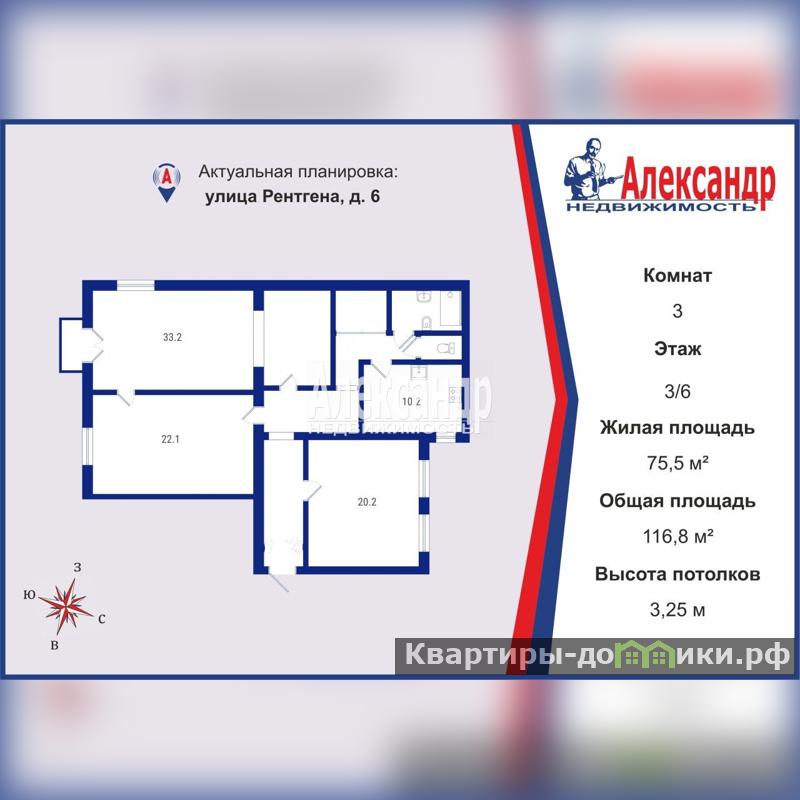 1705202 В одном из красивейших районов Санкт-Петербурга, в прямой продаже 3 комн. квартира, в самом центре Петроградки. Объект недвижимости, с параметрами 117/ 33+22+20/ 10 м кв, в хорошем состоянии, с оригинальным ремонтом, расположен на 3/6 этажного, кирпичного дома. За двойной дверью ( металлическая и стеклянная), при входе в квартиру, красиво оформленная прихожая, 3 просторные комнаты, два сан.узла, большая гардеробная, небольшой балкон, кухня оборудованная мебелью и бытовой техникой, и отдельная зона приема пищи 10 м кв, примыкающая к гостиной. Высокие потолки- 3,25 м, создают ощущение свободного пространства и дополнительной площади. На окнах современные ст/пакеты. Полы: в местах общего пользования кафельная плитка, в комнатах - ламинат. Планировка объекта - двусторонняя: две комнаты выходят на ул. Рентгена, кухня и третья комната - в закрытый зеленый двор. Толстые кирпичные стены, квартира с хорошей тепло и шумоизоляцией. Вход с огороженного двора. Имеется парковочное место на придомовой территории.