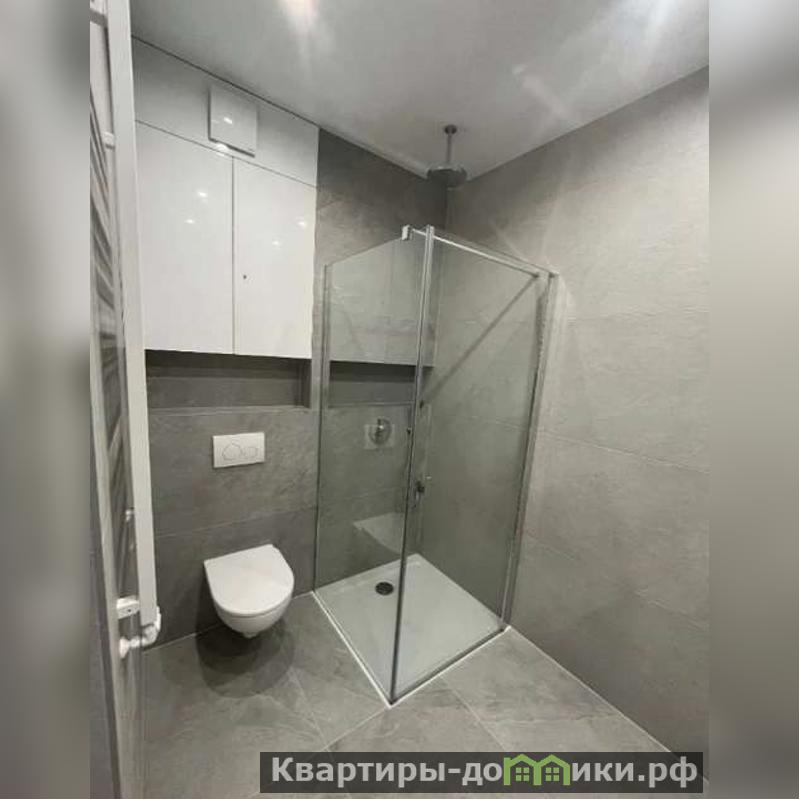 Санузел совмещенного формата. Просторная душевая с потолочной лейкой, встроенный в стену унитаз, широкая тумба с раковиной, вмещающая полотенца, мыло и прочие хозяйственные принадлежности.