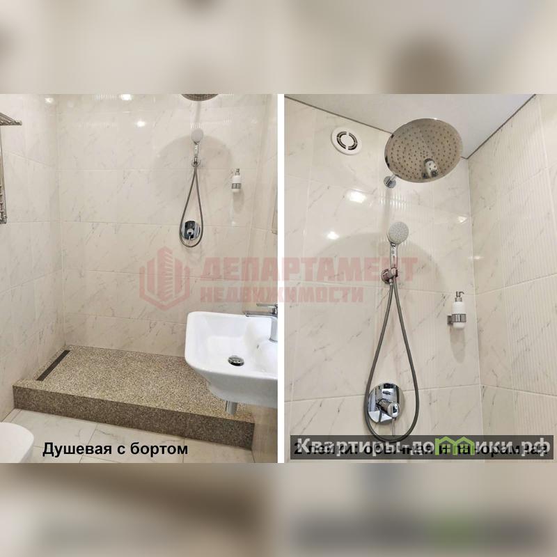 Ванная комната из холла через складную дверь. Просторно. Всё в плитке. Душевой поддон с направленным сливом. Бортик по щиколотку. Две лейки душа: обычная и панорамная. Над раковиной сенсорное зеркало с подсветкой. Унитаз - инсталяция. Сантехника фирмы "ROCA".