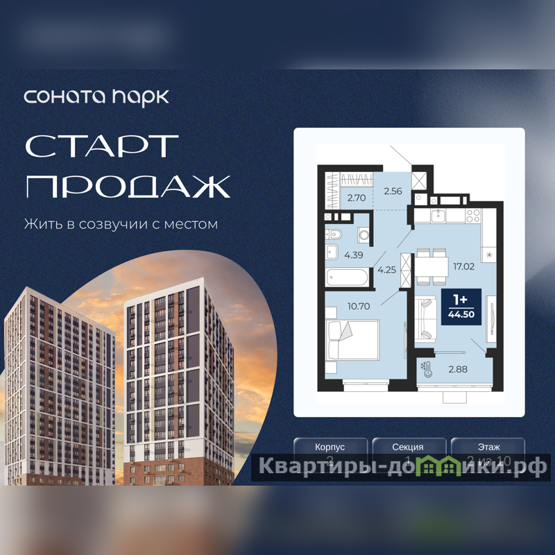1-комн. квартира с предчистовой отделкой в ЖК "Соната Парк" на 2 этаже. Общая площадь: 43.06 кв.м., жилая: 10.7 кв.м., площадь просторной кухни-столовой: 17.02 кв.м. Все окна выходят на одну сторону. В квартире одна лоджия, один совмещенный санузел. Высота потолков 2.72 м.
