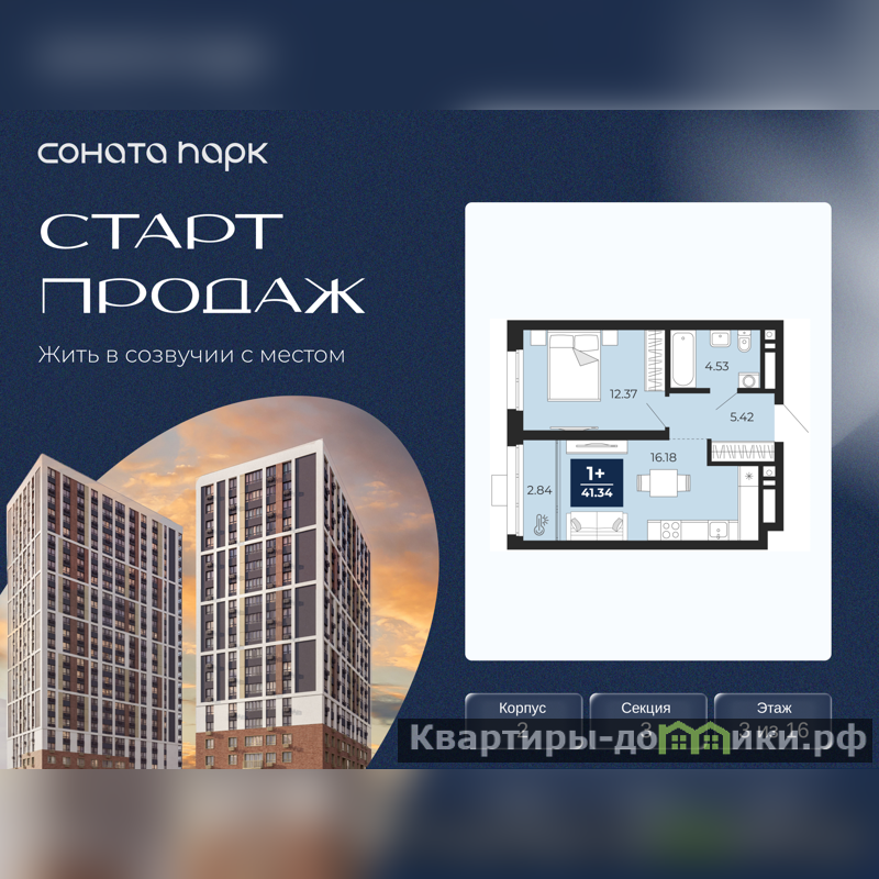 Продается 1-комн. квартира от застройщика с предчистовой отделкой в ЖК "Соната Парк" на 3 этаже. Общая площадь: 39.92 кв.м., жилая: 12.37 кв.м., площадь просторной кухни-столовой: 16.18 кв.м. Все окна выходят на одну сторону. В квартире одна лоджия, один совмещенный санузел. Высота потолков 2.72 м.