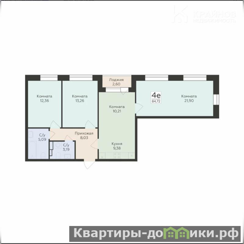 Комната 12.36 кв.м 13.26 кв.м. 21.9 кв.м и кухня 19.4 кв.м. с выходом на лоджию!