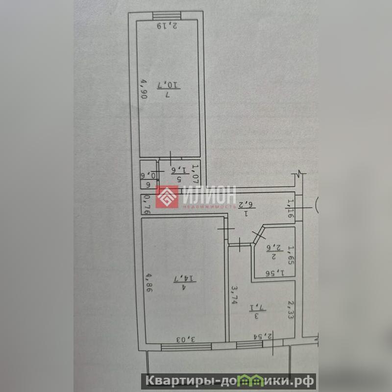 - Площадь: Общая площадь составляет 43.5 кв.м., включая две отдельные комнаты площадью 14.7 и 10.7 кв.м. соответственно.