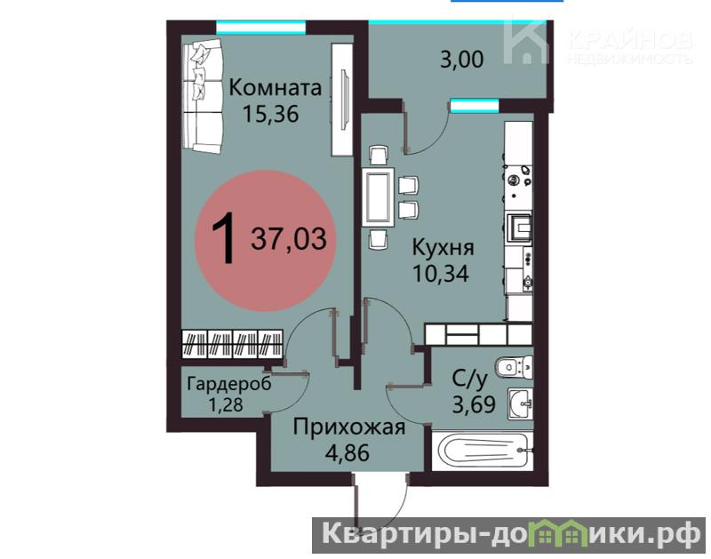 Однокомнатная квартира, общей площадью 37,03 кв.м (комната 15 кв.м, кухня 10,34 кв.м), расположенная по адресу ул. Острогожская, дом 156/3 на 8 этаже 17-этажного дома.