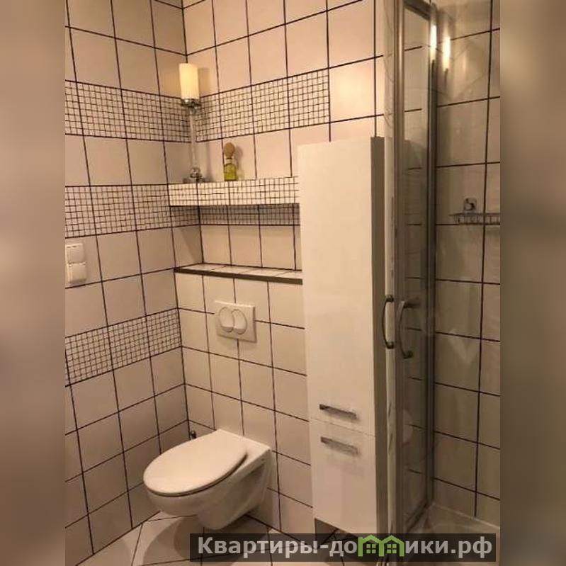 Санузел совмещенный, с душевой кабиной. Удобная планировка: подвесной унитаз со скрытой инсталляцией облегчает уборку, стиральная машинка освобождает от ручной стирки, а ящики и полочки хранят косметические принадлежности.