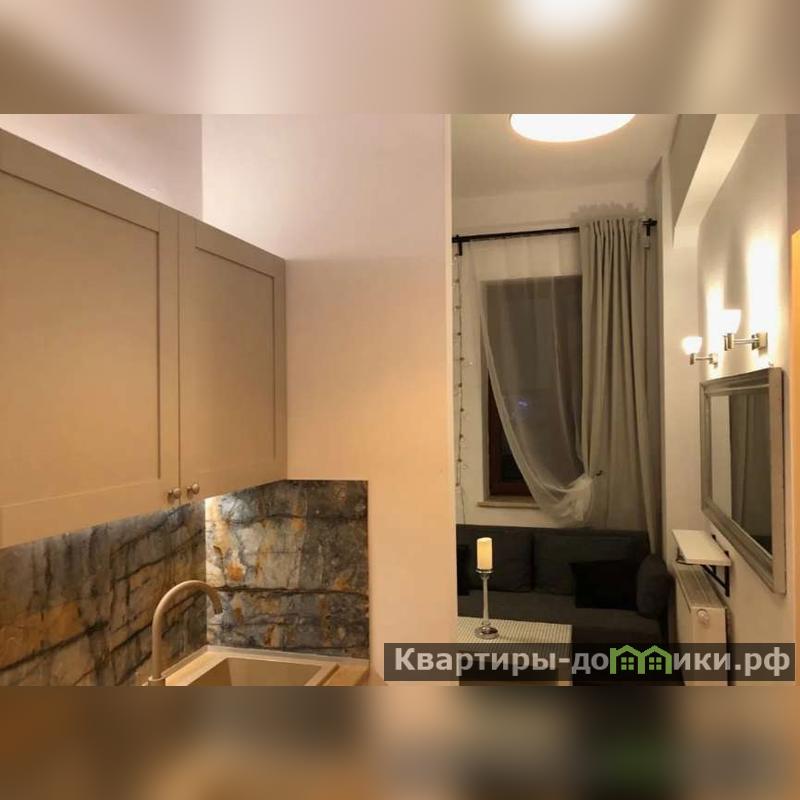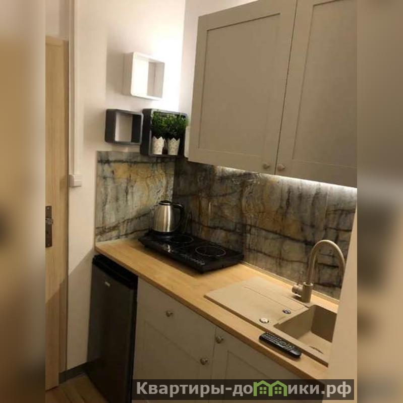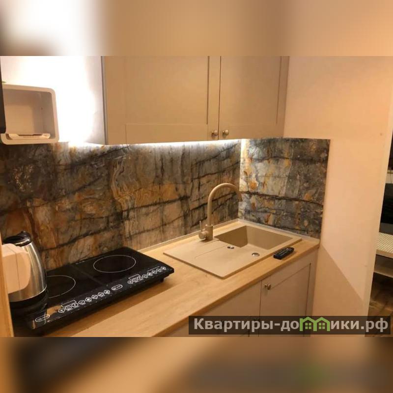Кухня небольшая, прямая. Встроенные техника - варочная панель, П/М машина, холодильник и рабочая столешница с мойкой создают удобства для приготовления пищи.