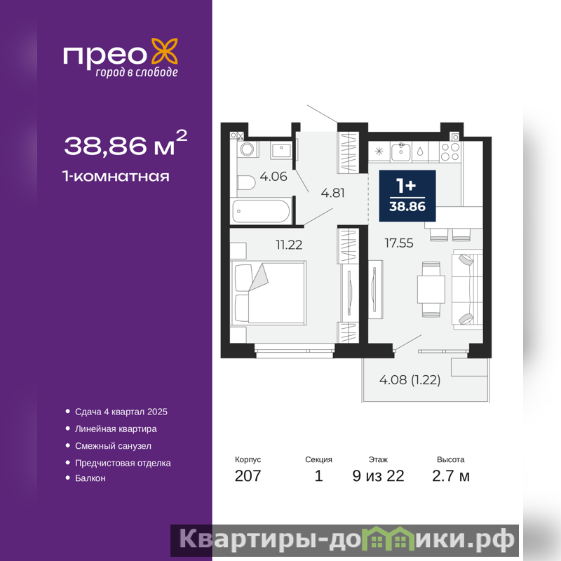 Продается однокомнатная квартира от застройщика с предчистовой отделкой в ЖК "Прео" на 9 этаже. Общая площадь: 38.86 кв.м., жилая: 11.22 кв.м., площадь просторной кухни-столовой: 17.55 кв.м. Все окна выходят на одну сторону. В квартире один балкон, один совмещенный санузел. Высота потолков 2.7 м.