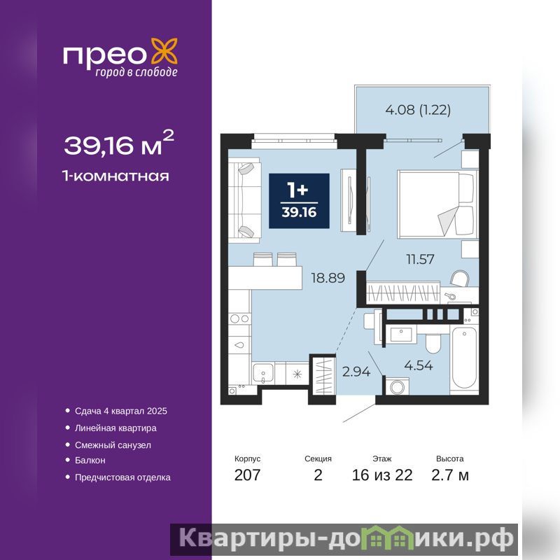 Просторная 1-комн. квартира с предчистовой отделкой в ЖК "Прео" на 16 этаже. Общая площадь: 39.16 кв.м., жилая: 11.57 кв.м., площадь просторной кухни-столовой: 18.9 кв.м. Все окна выходят на одну сторону. В квартире один балкон, один совмещенный санузел. Высота потолков 2.7 м.