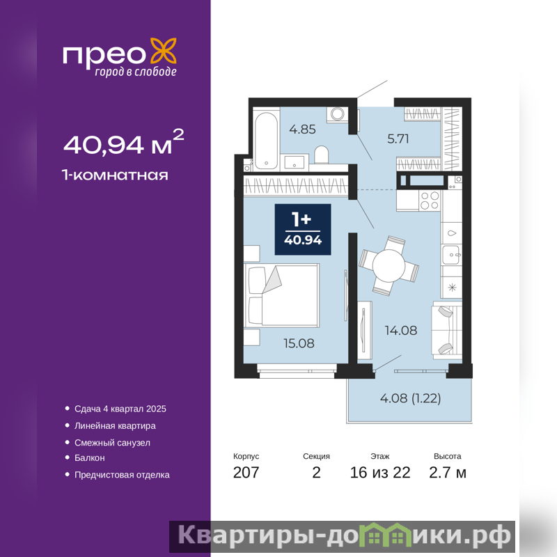 Продается однокомнатная квартира от застройщика с предчистовой отделкой в ЖК "Прео" на 16 этаже. Общая площадь: 40.94 кв.м., жилая: 15.08 кв.м., площадь просторной кухни-столовой: 14.08 кв.м. Все окна выходят на одну сторону. В квартире один балкон, один совмещенный санузел. Высота потолков 2.7 м.