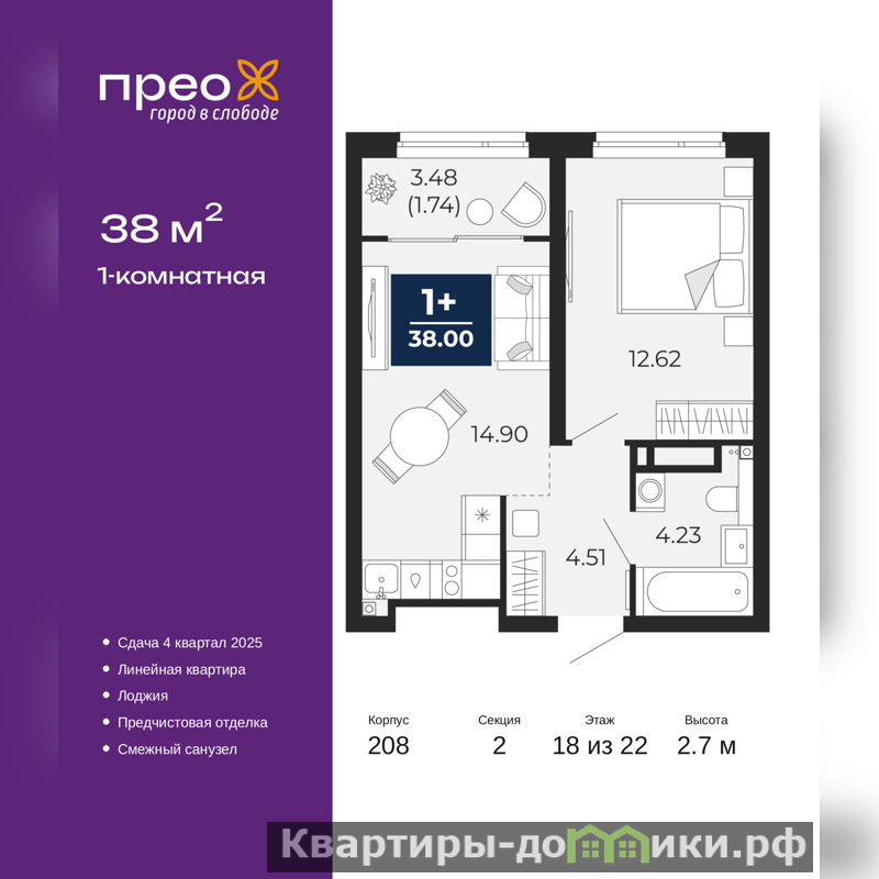 1-комн. квартира с предчистовой отделкой в ЖК "Прео" на 18 этаже. Общая площадь: 38 кв.м., жилая: 12.62 кв.м., площадь просторной кухни-столовой: 14.9 кв.м. Все окна выходят на одну сторону. В квартире одна лоджия, один совмещенный санузел. Высота потолков 2.7 м.