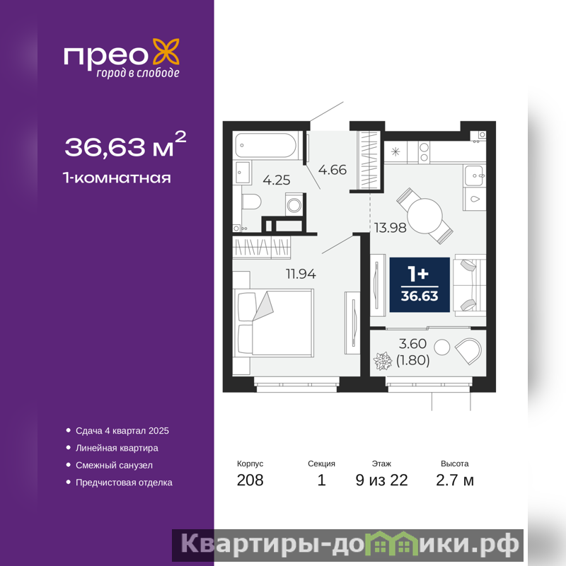 Однокомнатная квартира от застройщика с предчистовой отделкой в ЖК "Прео" на 9 этаже. Общая площадь: 36.63 кв.м., жилая: 11.94 кв.м., площадь просторной кухни-столовой: 13.98 кв.м. Все окна выходят на одну сторону. В квартире один совмещенный санузел. Высота потолков 2.7 м.
