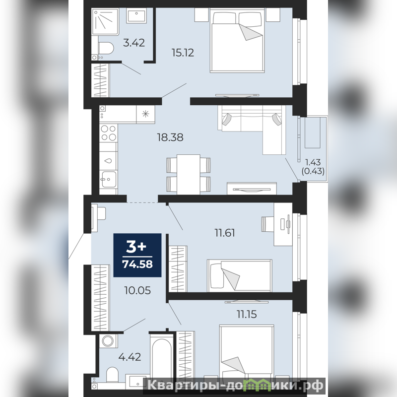 Трехкомнатная квартира с предчистовой отделкой в ЖК "Прео" на 11 этаже. Общая площадь: 74.58 кв.м., жилая: 37.88 кв.м., площадь просторной кухни-столовой: 18.38 кв.м. Комнаты изолированные, все окна выходят на одну сторону. В квартире один балкон, два совмещенных санузла. Высота потолков 2.7 м.