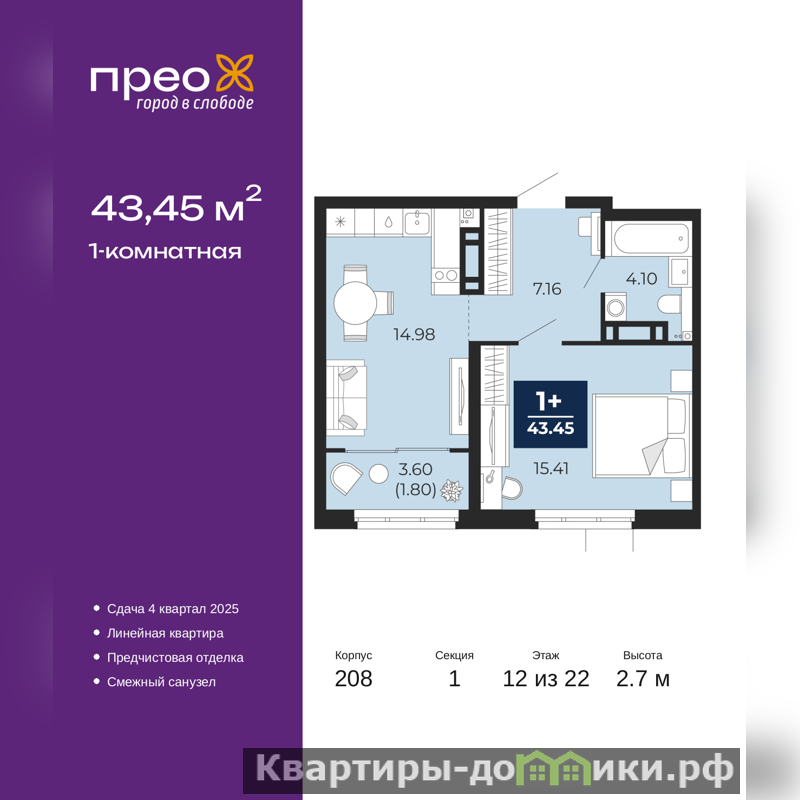 Однокомнатная квартира с предчистовой отделкой в ЖК "Прео" на 12 этаже. Общая площадь: 43.45 кв.м., жилая: 15.41 кв.м., площадь просторной кухни-столовой: 14.98 кв.м. Все окна выходят на одну сторону. В квартире один совмещенный санузел. Высота потолков 2.7 м.
