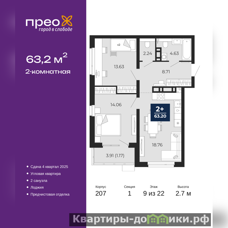 Продается двухкомнатная квартира с предчистовой отделкой в ЖК "Прео" на 9 этаже. Общая площадь: 63.2 кв.м., жилая: 27.69 кв.м., площадь просторной кухни-столовой: 18.76 кв.м. Угловая квартира, окна oбecпeчивaют paвнoмepнoe ocвeщeниe в тeчeниe дня. В квартире одна лоджия, один совмещенный и один раздельный санузел. Высота потолков 2.7 м.
