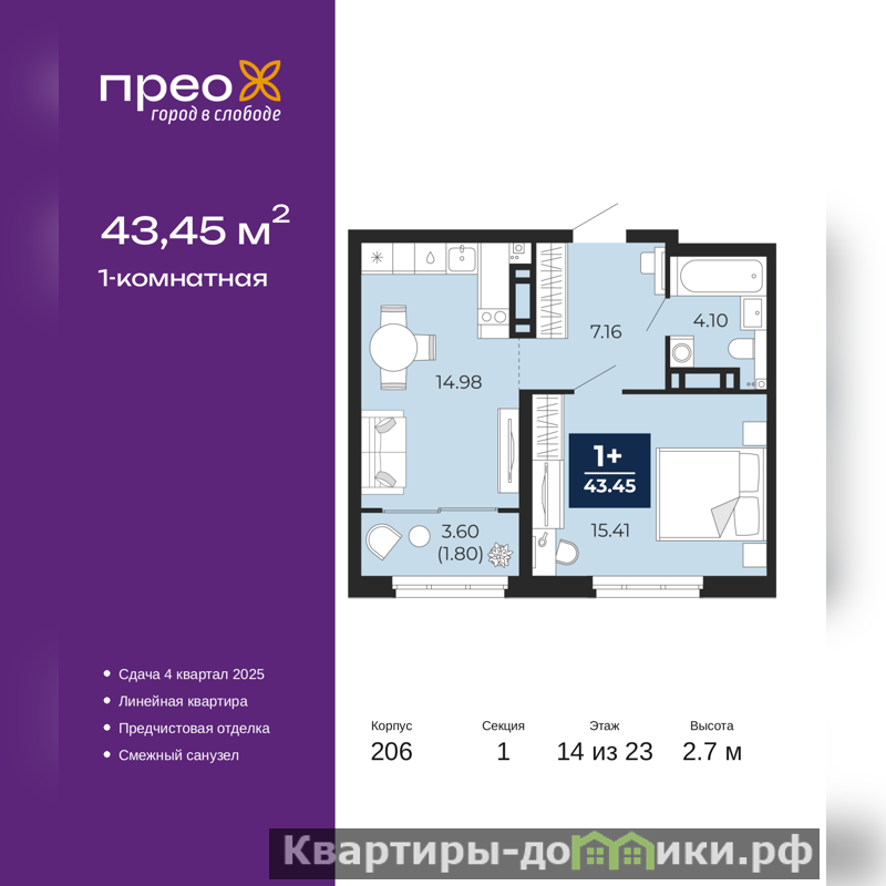Просторная 1-комн. квартира с предчистовой отделкой в ЖК "Прео" на 14 этаже. Общая площадь: 43.45 кв.м., жилая: 15.41 кв.м., площадь просторной кухни-столовой: 14.98 кв.м. Все окна выходят на одну сторону. В квартире один совмещенный санузел. Высота потолков 2.7 м.