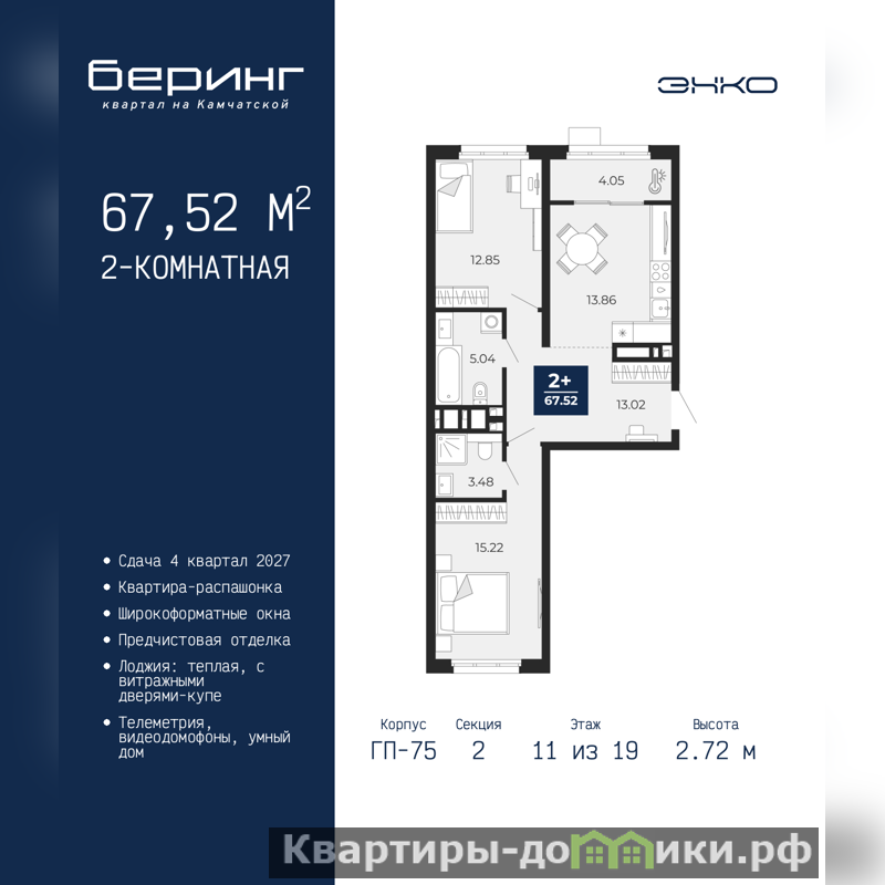 Двухкомнатная квартира от застройщика с предчистовой отделкой в ЖК "Беринг" на 11 этаже. Общая площадь: 67.52 кв.м., жилая: 28.07 кв.м., площадь просторной кухни-столовой: 13.86 кв.м. Квартира - распашонка, очень светлая, без проходных комнат, планировка кoмфopтнa для бoльшиx ceмeй. В квартире одна лоджия, два совмещенных санузла. Высота потолков 2.72 м.