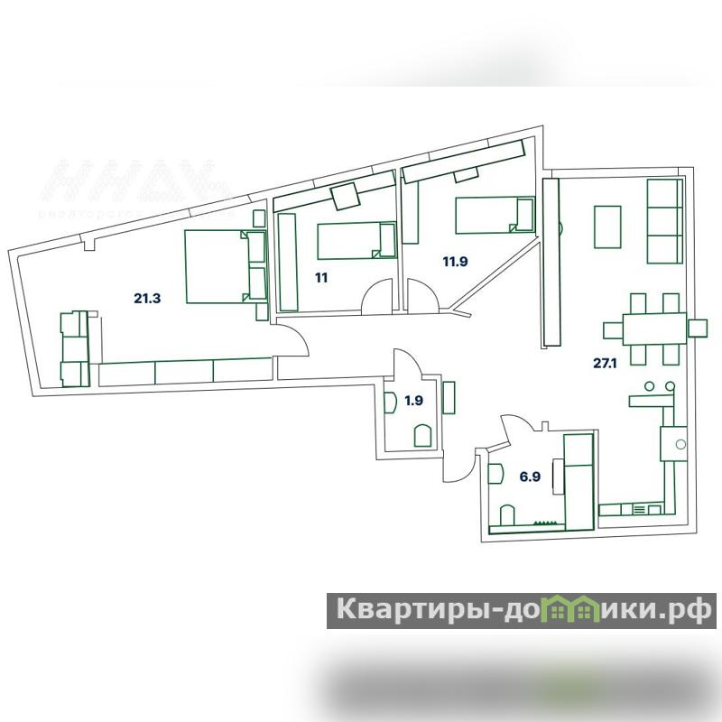 Общая площадь квартиры 91 м? (с коэффициентом лоджий 0,5м2). Эргономичная планировка для большой семьи: три изолированные спальни (21.3 м2, 11.9 м2, 11 м2), просторная кухня-гостиная (27.1 м2), два совмещённых санузла. Из прихожей организована гардеробная для организации хранения вещей. Угловая большая спальная комната с двумя окнами наполнена светом, панорамное остекление и вид на реку и закат. Увеличенный оконные проемы создают ощущение воздуха и комфорта во всей квартире. Из всех комнат завораживающий вид на реку.