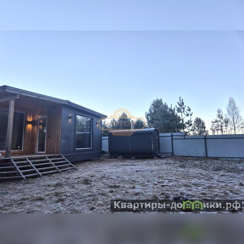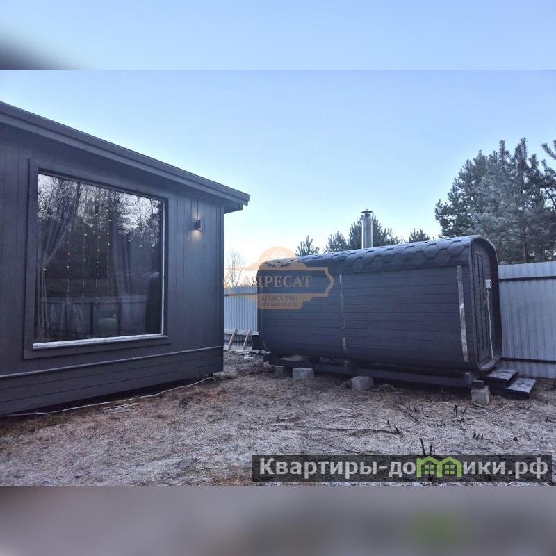 В доме высокие потолки и панорамные окна — много света и ощущение простора. Кухня-гостиная, комната и санузел, всё эргономично и продуманно. Во всем доме установлены теплые полы и электрические конвекторы. Коммуникации подведены: электричество 15 кВт, вода - скважина 12 м, канализация - септик. Дом построен по каркасной технологии, утепление 200 мм, фундамент - винтовые сваи. <strong>На участке установлена баня. В доме выполнена полная отделка, вся мебель и техника остаются новым собственникам. </strong>Вы сразу можете заехать и жить или сдавать в аренду. На участке есть место для строительства еще одного дома.<br />