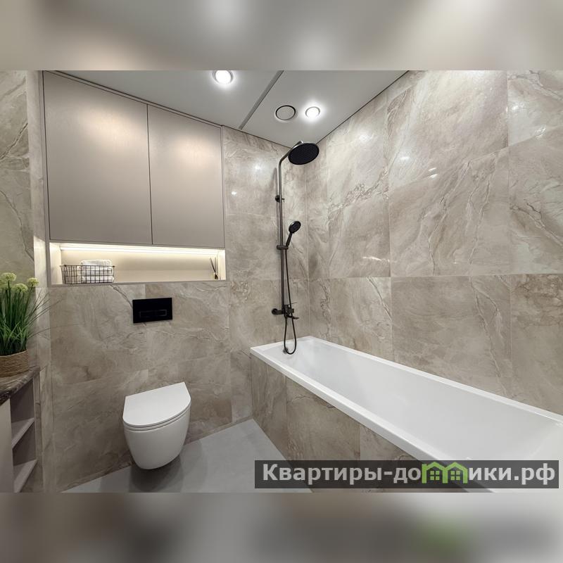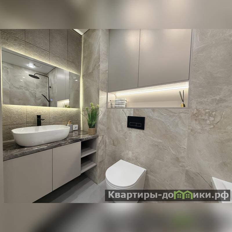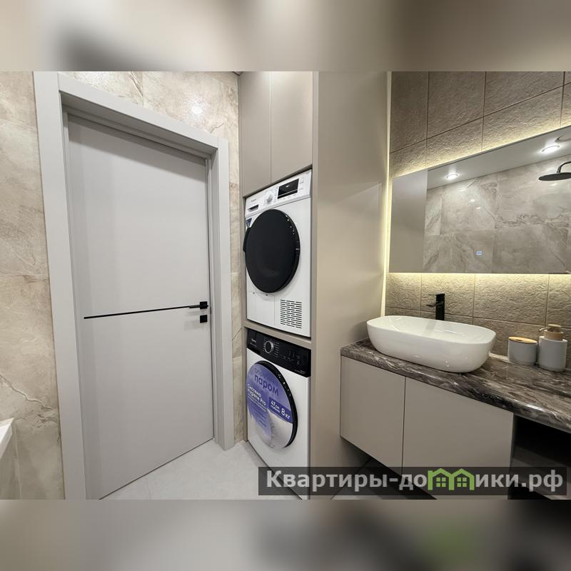 • Современный санузел: дорогая качественная сантехника, стиральная и сушильная машины. Стены и пол облицованы крупноформатным керамогранитом.<br />
