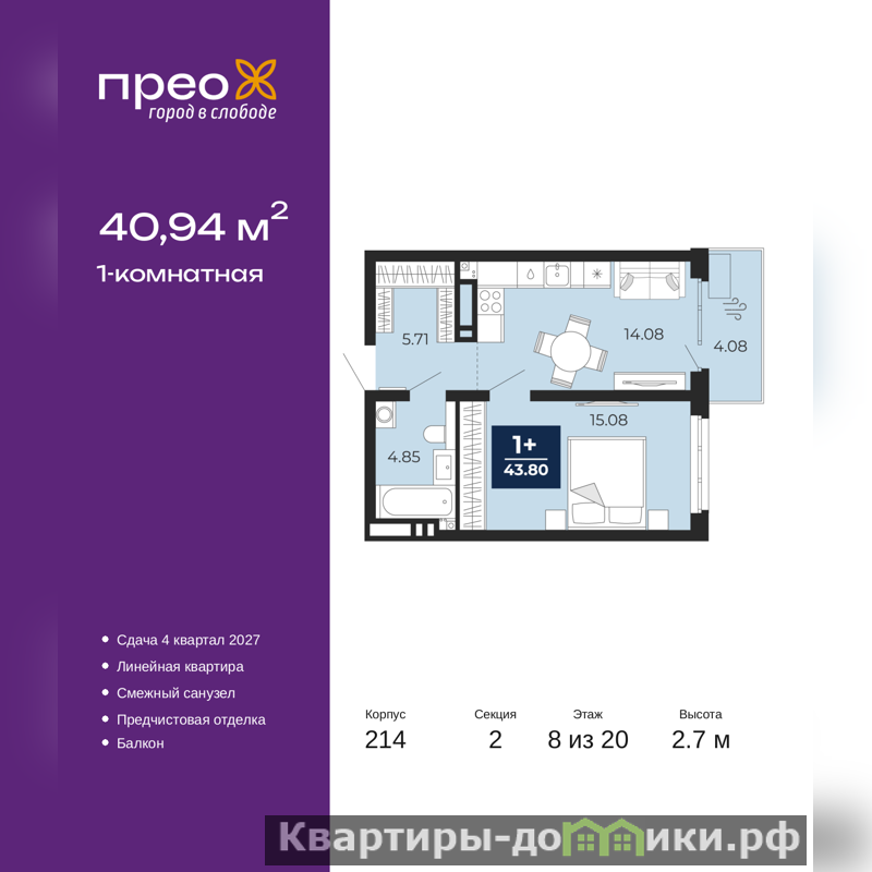 Продается 1-комн. квартира от застройщика с предчистовой отделкой в ЖК "Прео" на 8 этаже. Общая площадь: 40.94 кв.м., жилая: 15.08 кв.м., площадь просторной кухни-столовой: 14.08 кв.м. Все окна выходят на одну сторону. В квартире один балкон, один совмещенный санузел. Высота потолков 2.7 м.