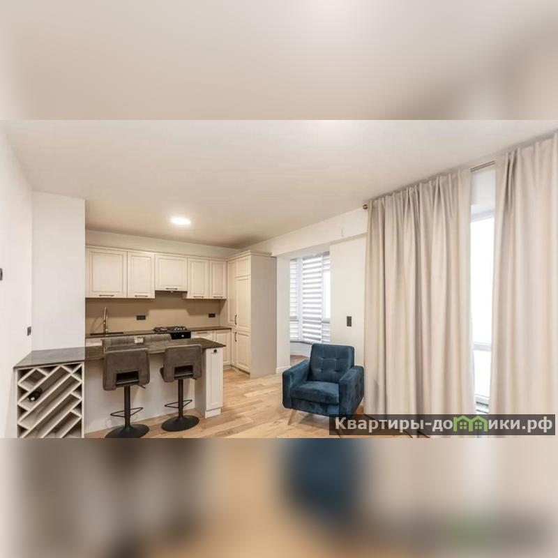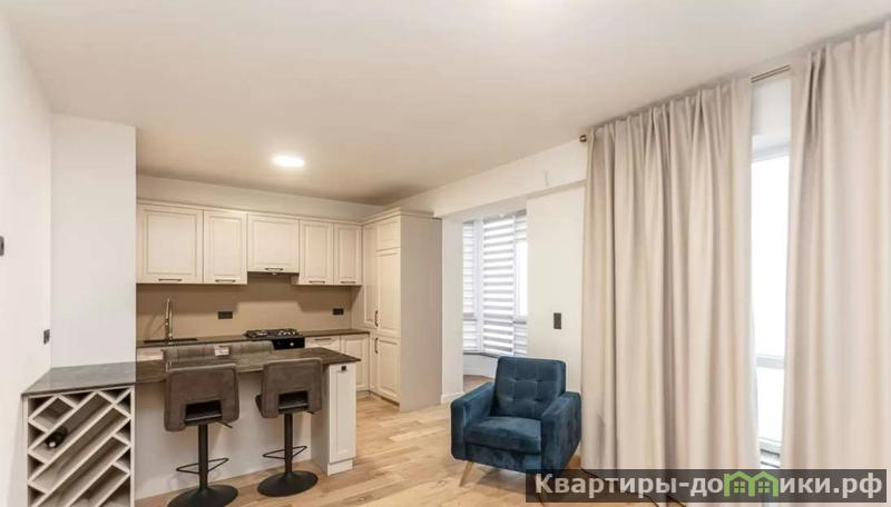 Открытая планировка с кухней-гостиной и отдельной спальней. В кухонной зоне угловой гарнитур кремового цвета с темной столешницей, барная стойка с винной полкой служит как место для приема пищи, дополнена высокими стульями.