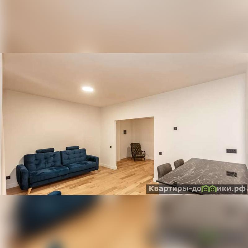 Просторная гостиная с большим синим диваном и креслом станут хорошим местом для встречи с друзьями или дорогими родственниками. Светлый паркет, белые стены, мягкое потолочное освещение.