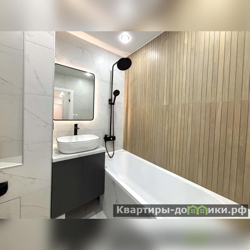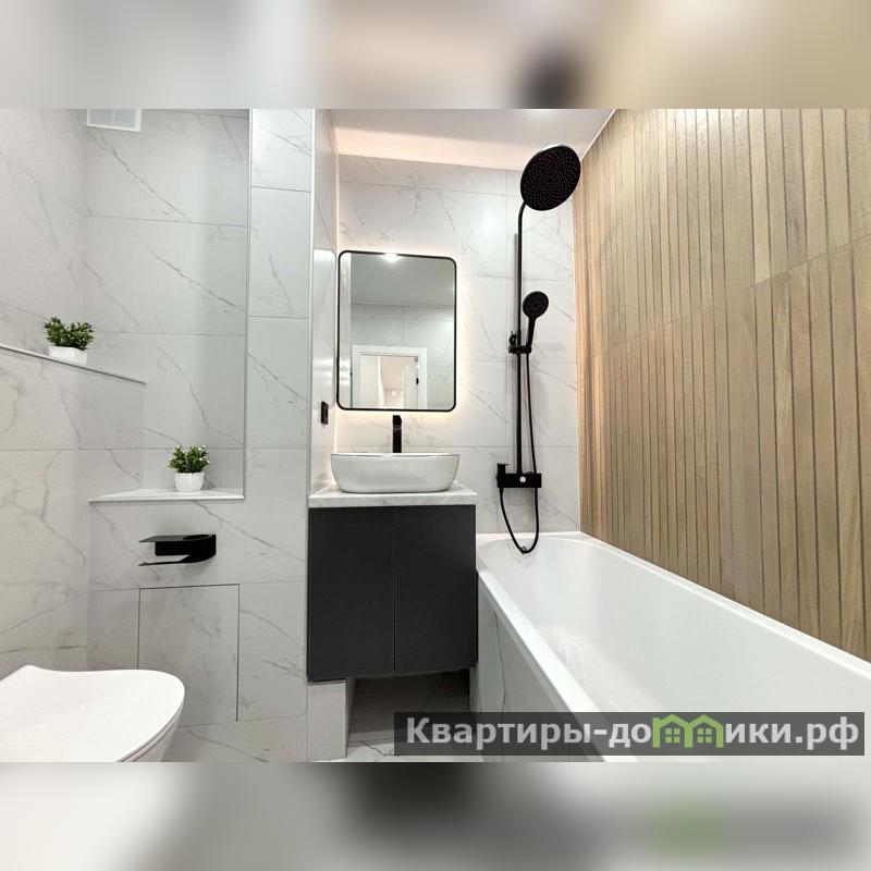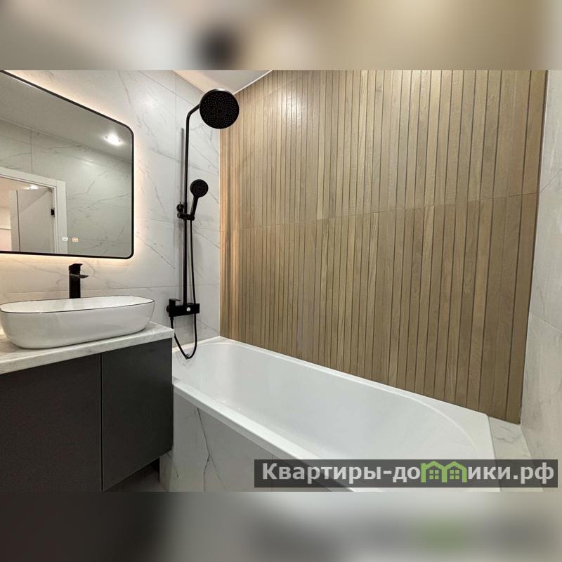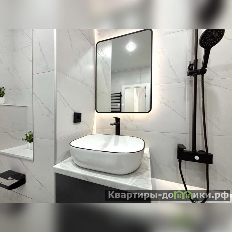 В ванной отделка кафелем, качественная сантехника, установлено большое зеркало с подсветкой.