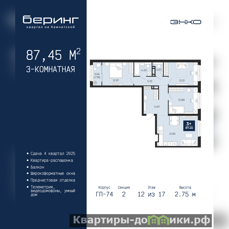 Трехкомнатная квартира с предчистовой отделкой в ЖК "Беринг" на 12 этаже. Общая площадь: 87.45 кв.м., жилая: 40.16 кв.м., площадь просторной кухни-столовой: 21.85 кв.м. Квартира - распашонка, без проходных комнат, окна выходят на paзные стороны дома. В квартире один балкон, один совмещенный и один раздельный санузел. Высота потолков 2.75 м.