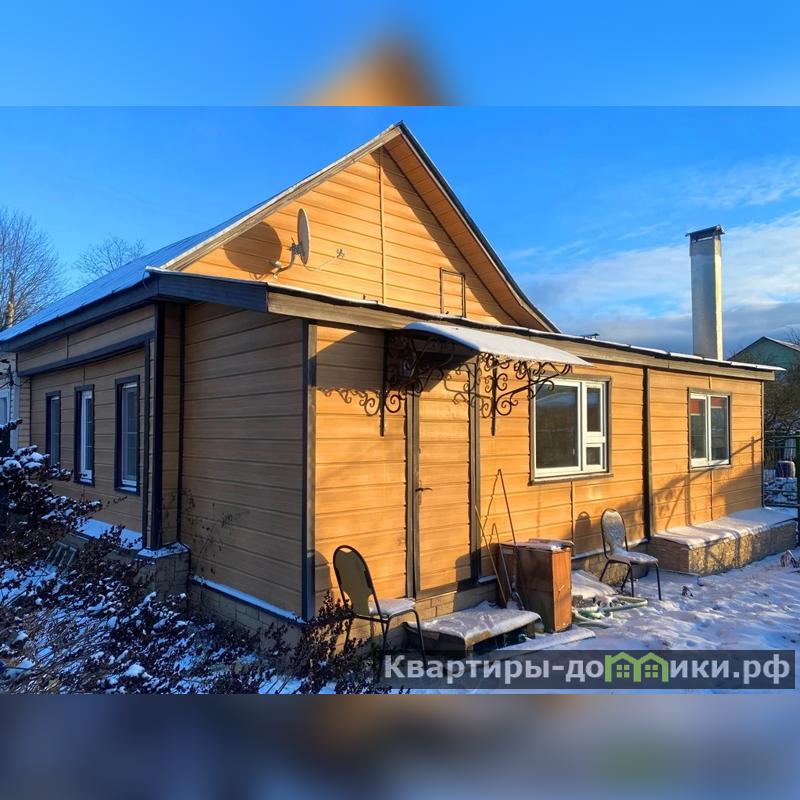 Дом построен из качественного бревна, обшит сайдингом, фундамент надёжный. Общая площадь 64 кв.м. (53 кв.м. + терраса 11 кв.м). Планировка: теплая терраса, кухня, санузел, проходная комната, основная комната. Есть 3 технических подпола, вода весной в них не стоит.