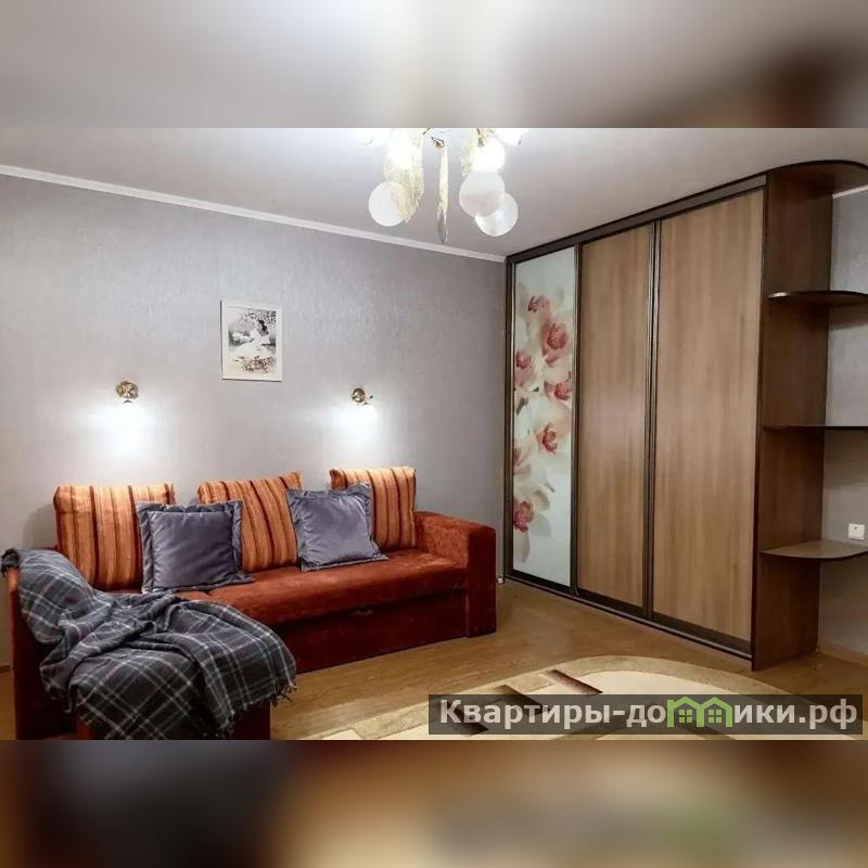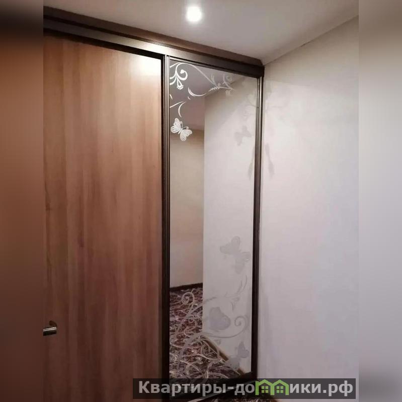 Удобная угловая кухня, в комнате диван и большой шкаф купе.