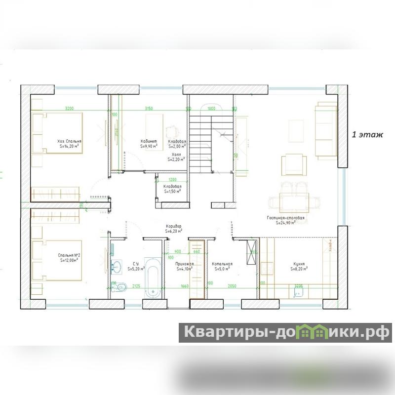 1 этаж: Просторная кухня-гостиная 33 кв.м с окнами на три стороны света и панорамной дверью на крытую террасу; три комнаты (10/12/14 кв.м), ванная комната, бойлерная, гардеробная, прихожая.