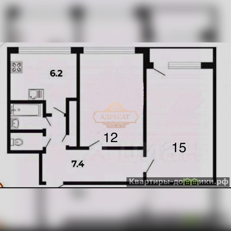 Общая площадь квартиры составляет 44 м2, комнаты 15 м2, 12 м2, кухня — 6,2 м2<br />